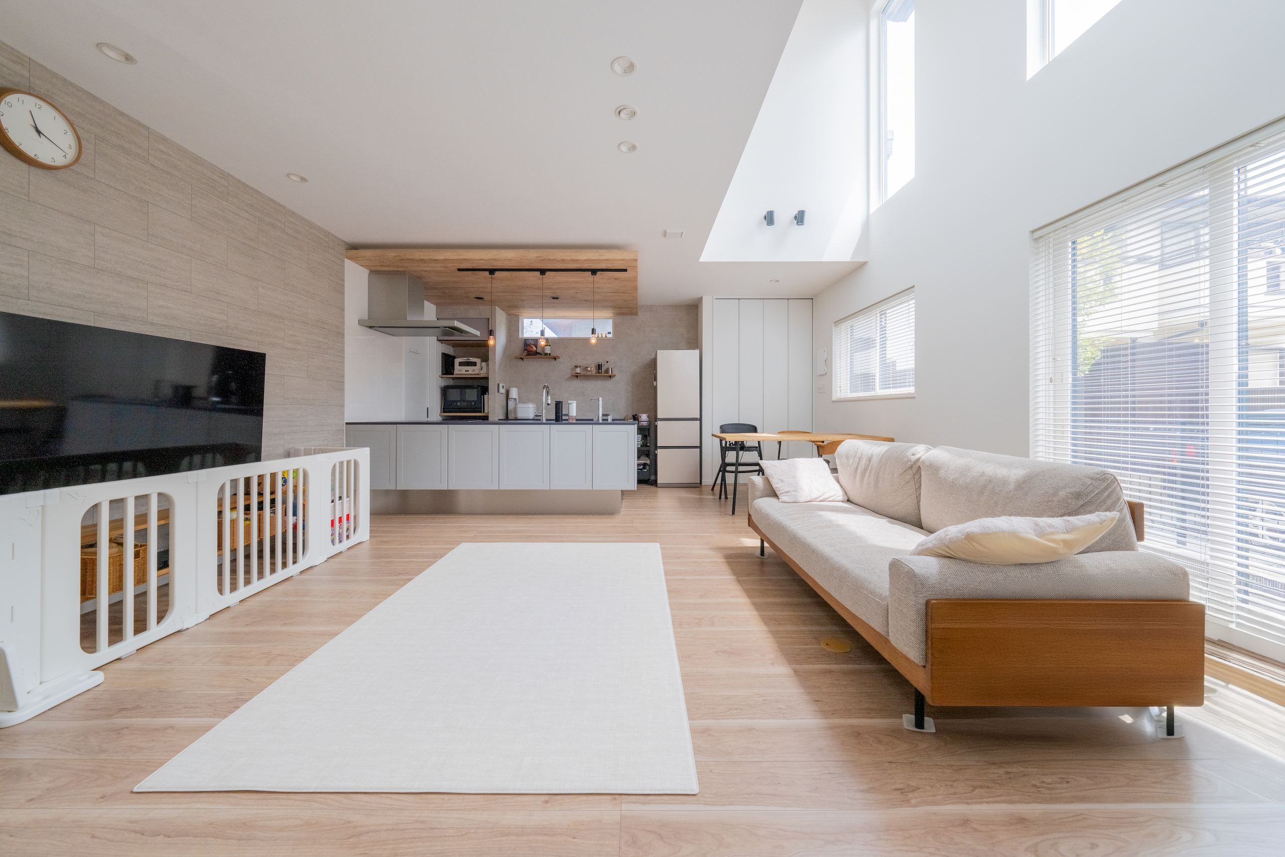 高窓から降り注ぐ自然光が、リビング全体をやわらかく包み込む吹き抜け空間。