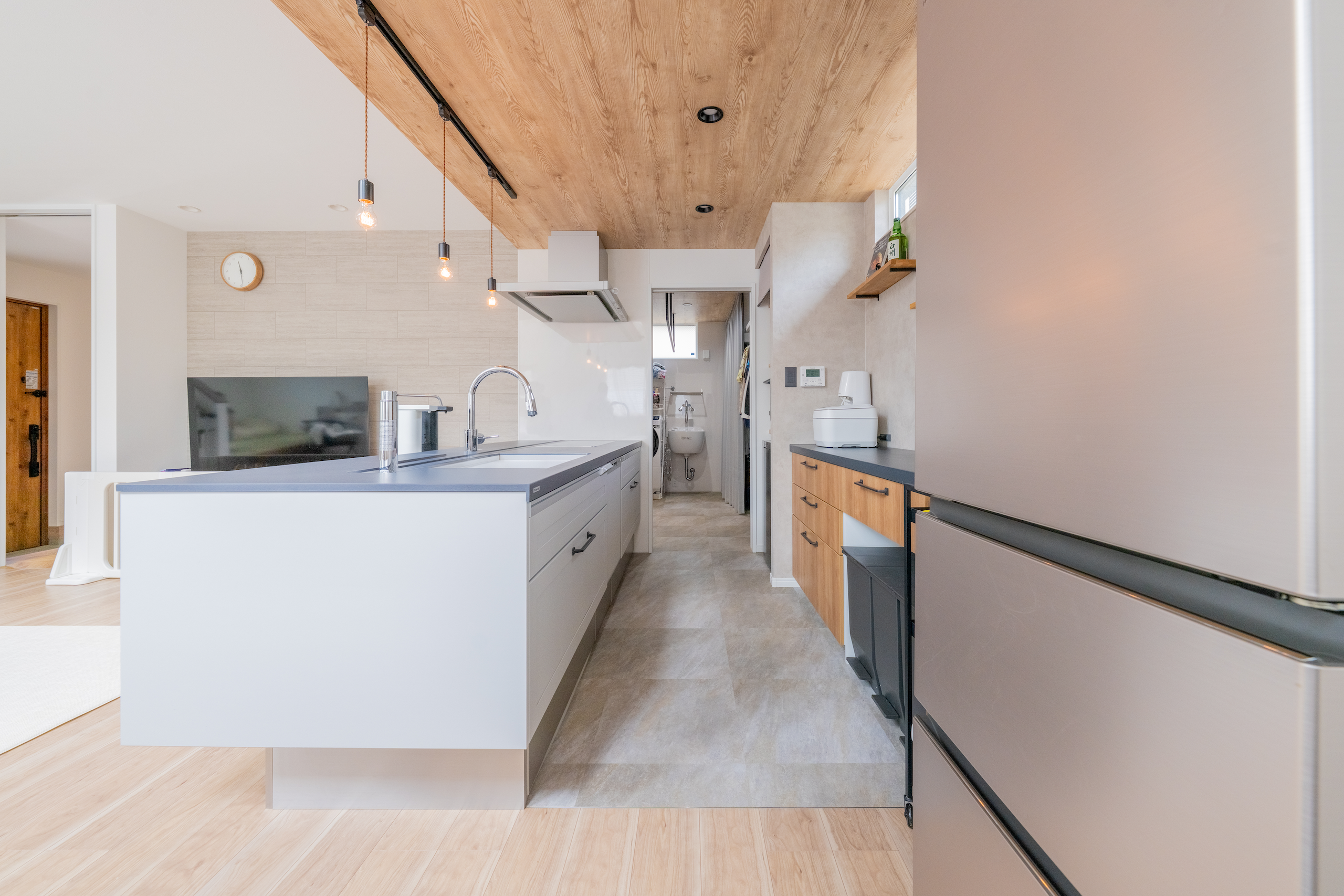 キッチンからランドリールーム、洗面室までを一直線につなぐ、