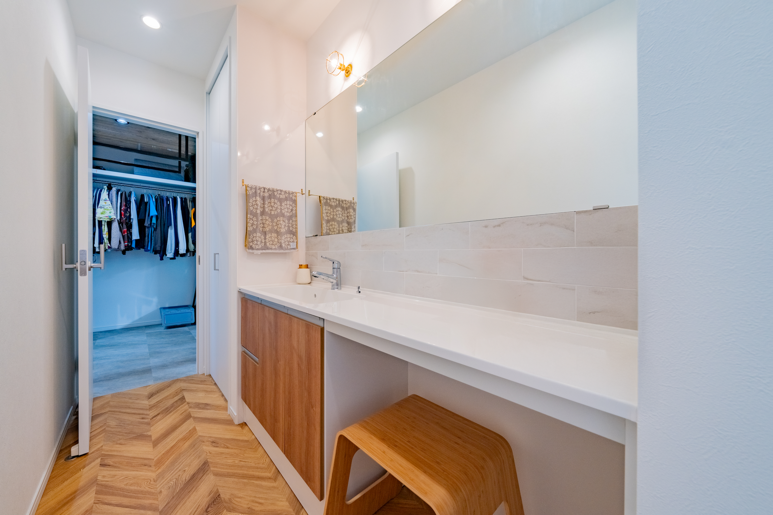 洗面とファミリークローゼットを直結させた効率的な動線設計。