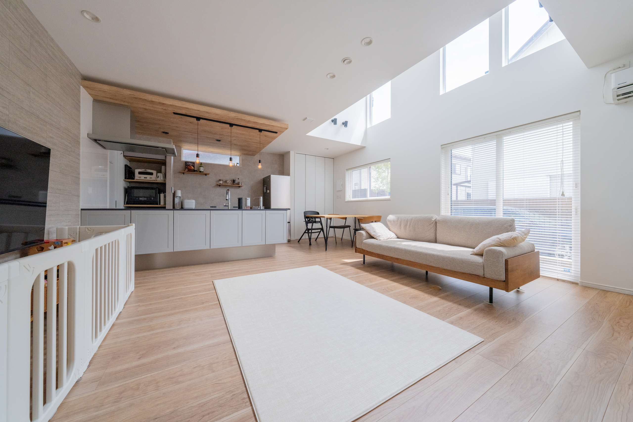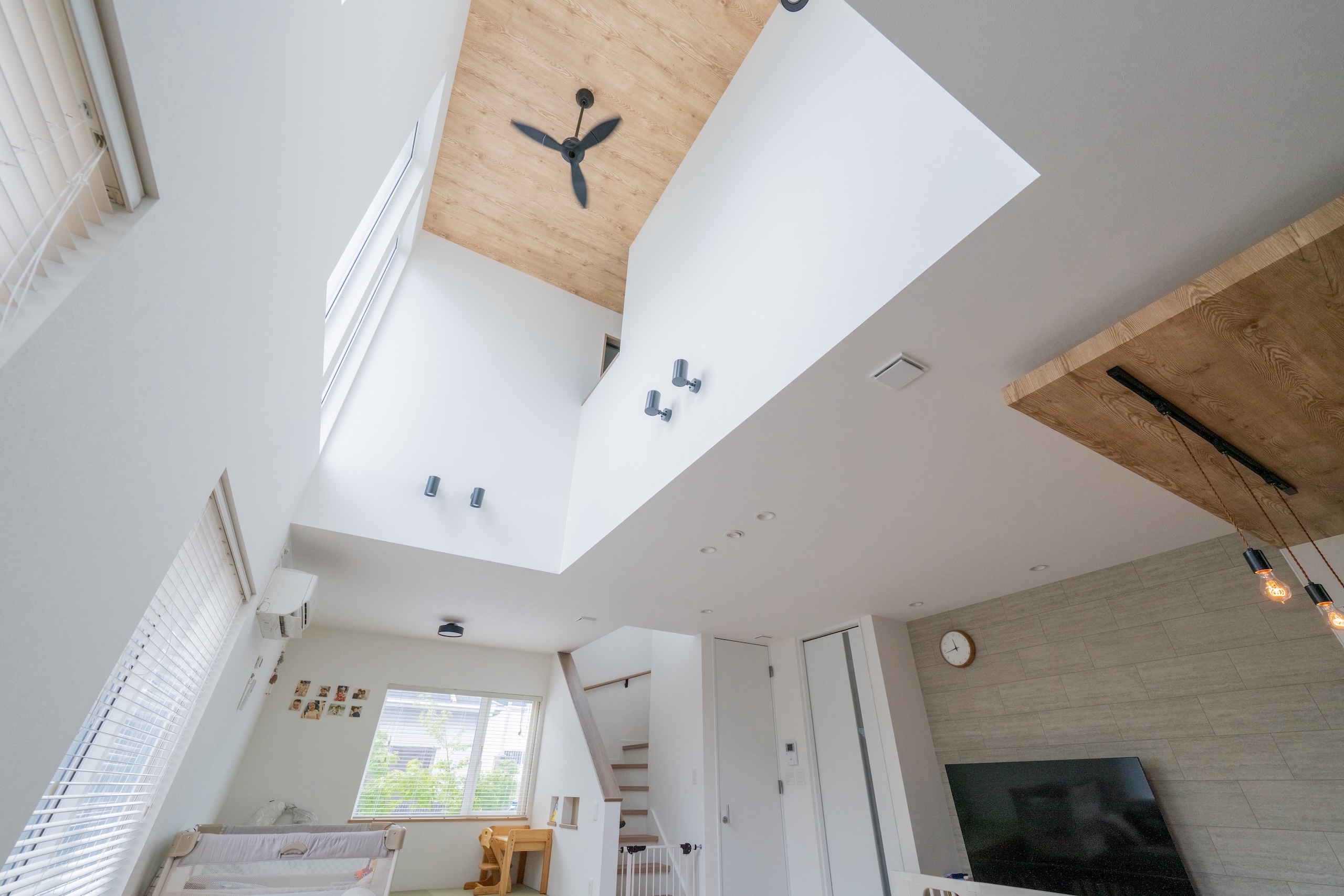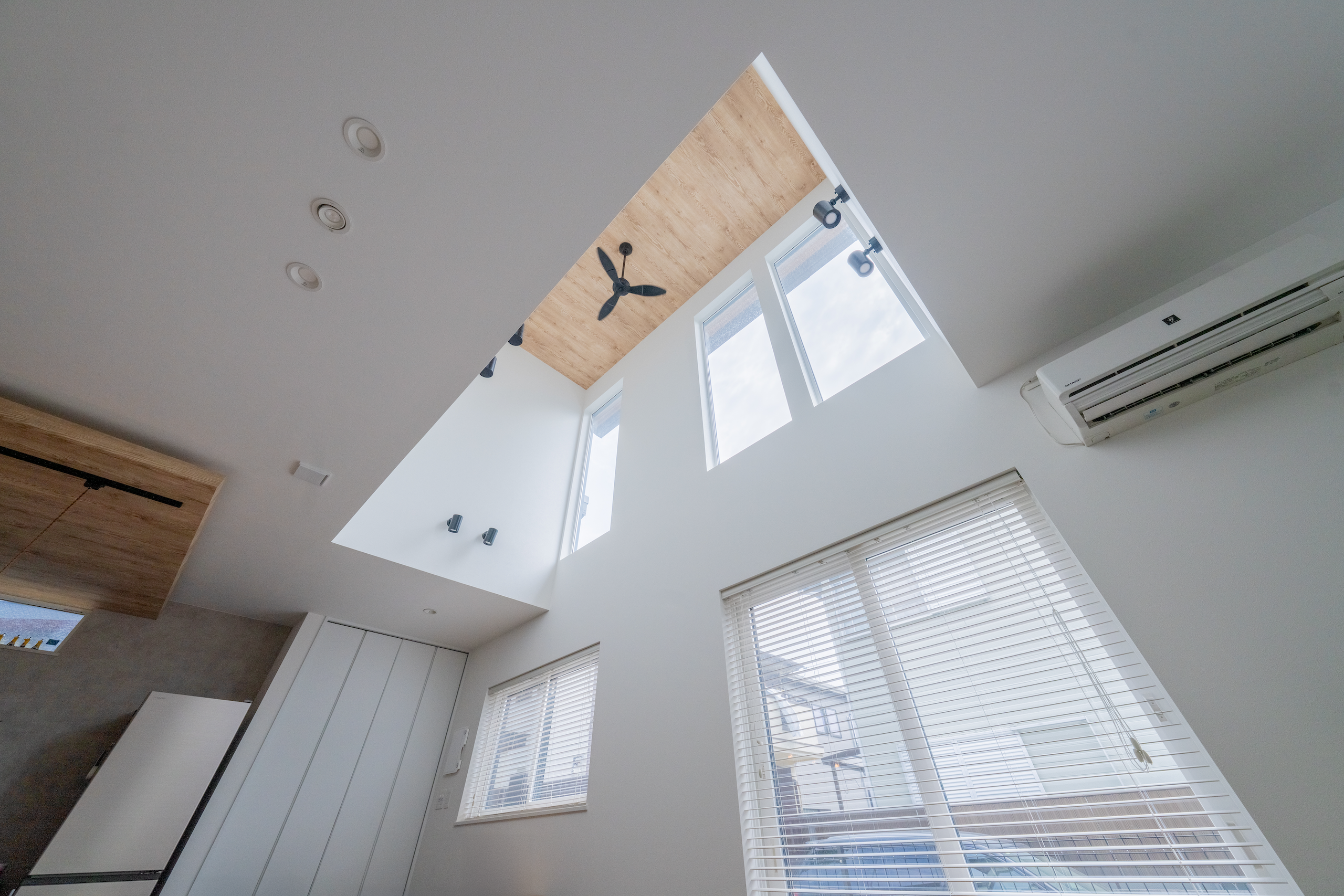 高窓から降り注ぐ自然光が、リビング全体をやわらかく包み込む吹き抜け空間。