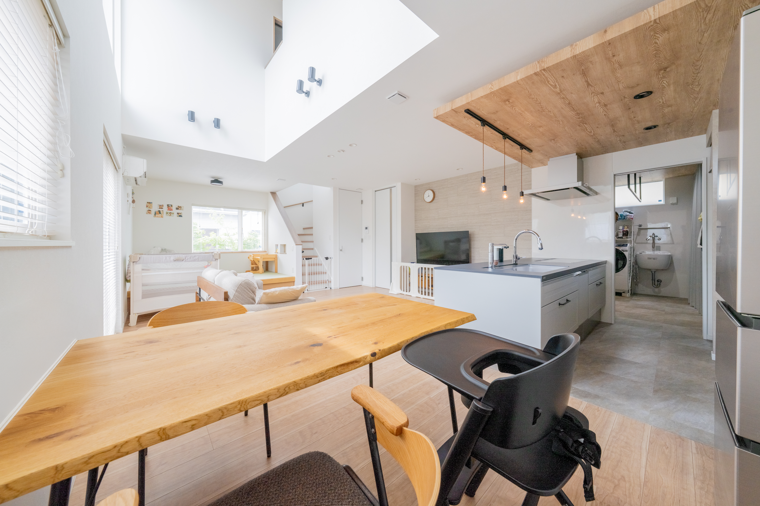 木目の天井とフローリングが、家族の時間をやさしく包み込みます。