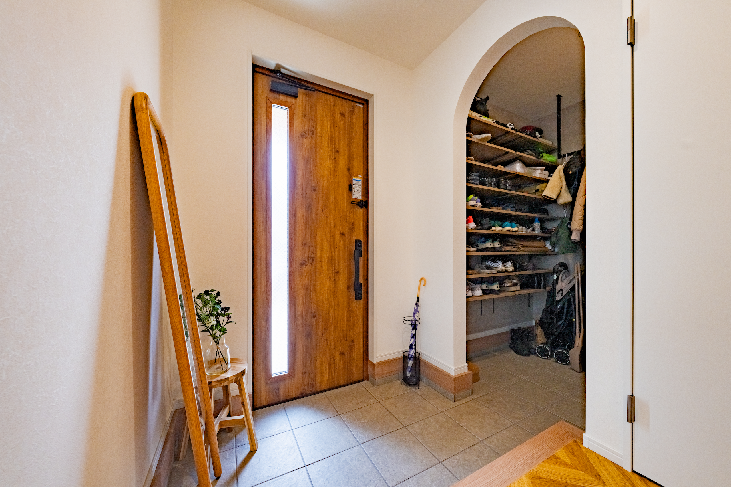 アプローチから玄関までのラインは、動線の美しさと機能性を両立。