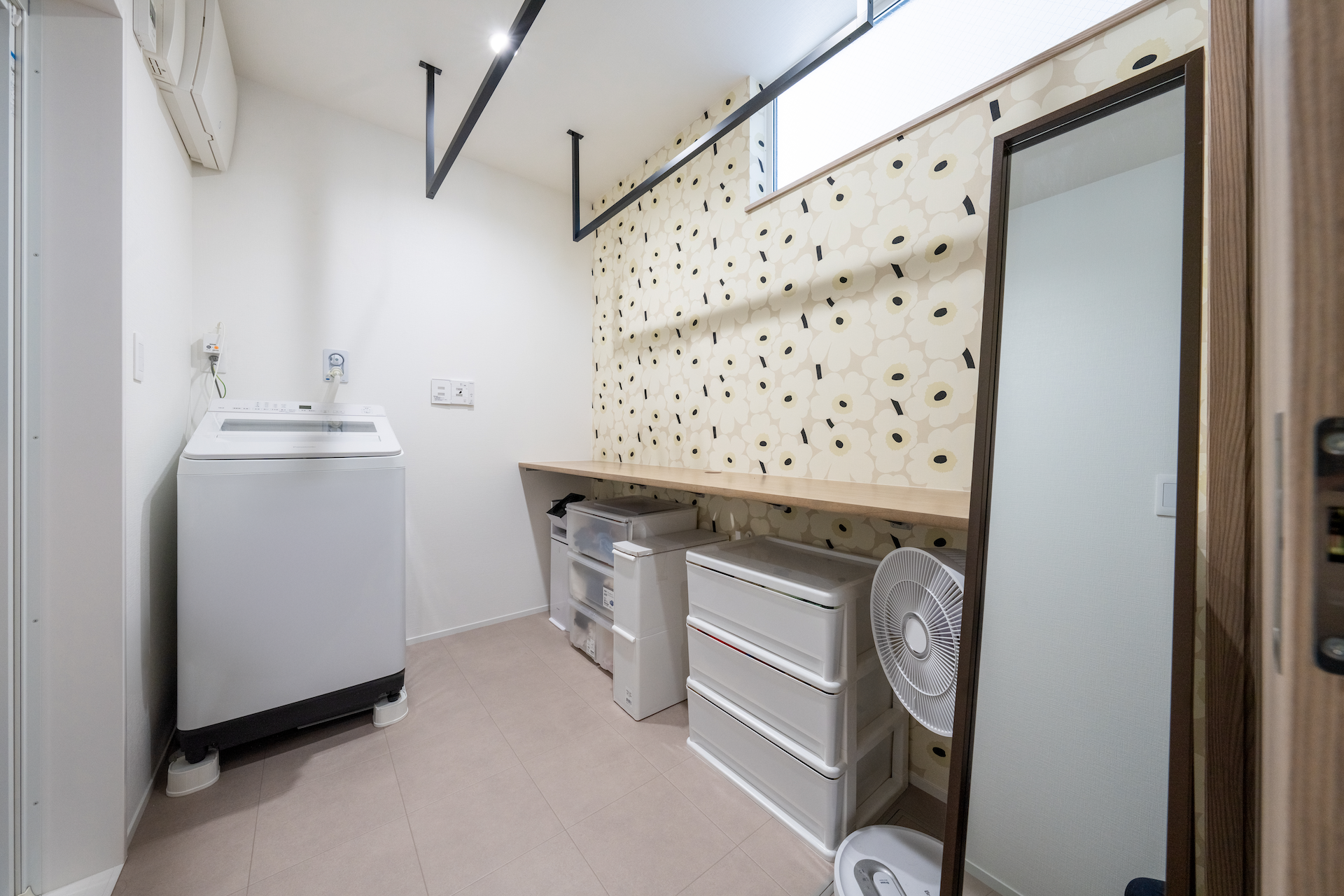 壁面にはやわらかな印象のアクセントクロスを取り入れ、機能一辺倒になりがちな家事室に、ほんの少しの楽しさと気分の上がる要素をプラス。