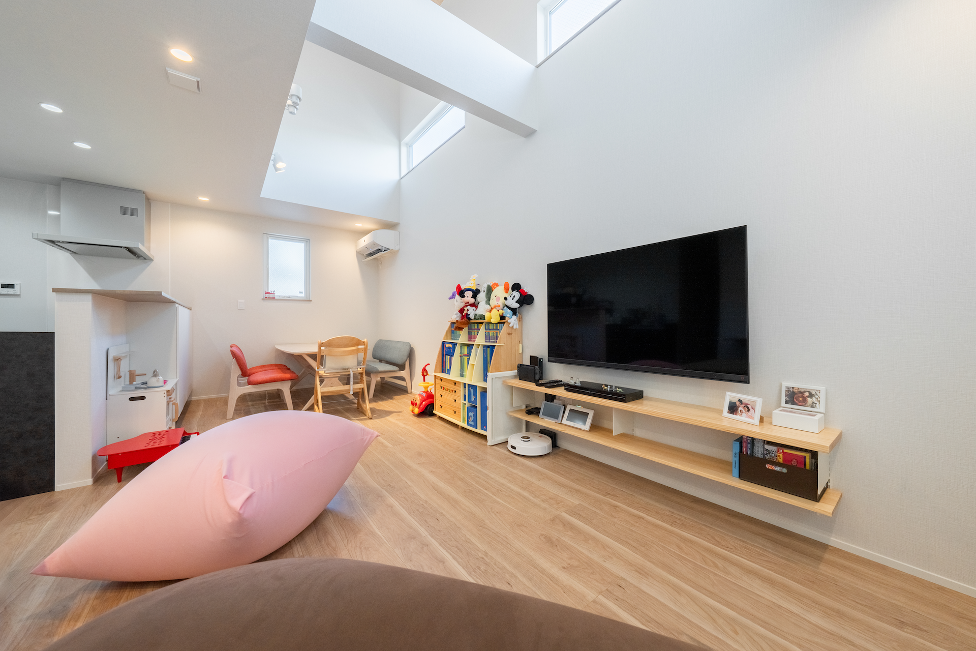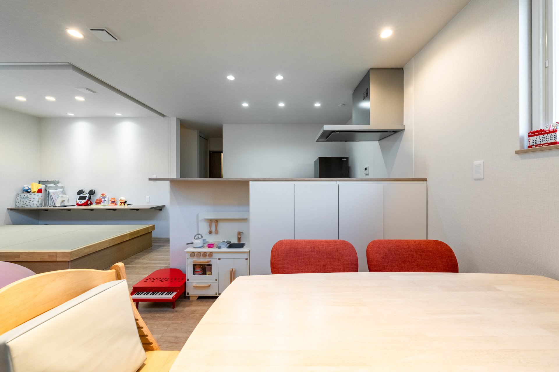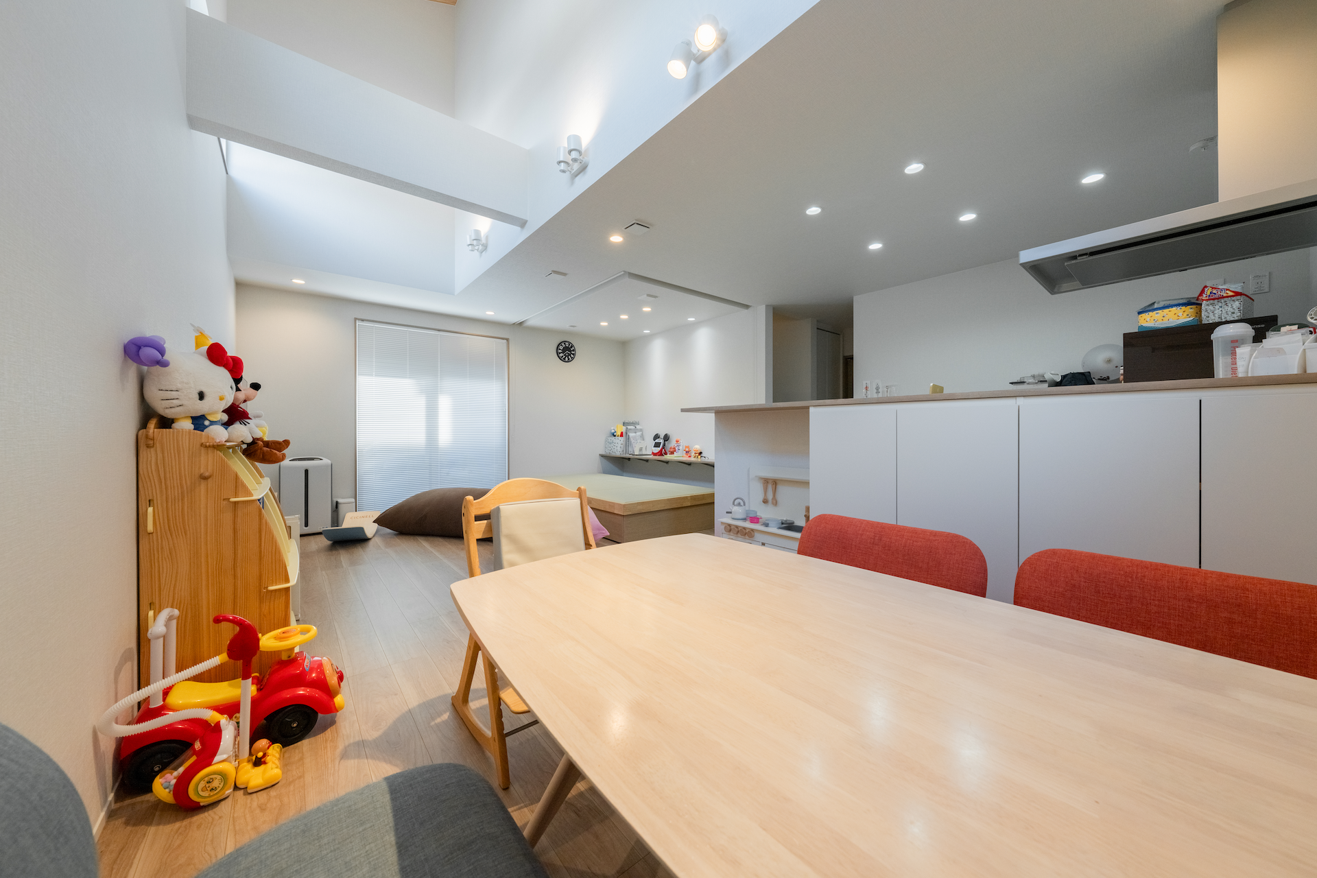 お子さまの遊び場やくつろぎのスペース、ダイニング、キッチンまでをゆるやかにつなぎ、日常の中に「集まる理由」が生まれる設計。