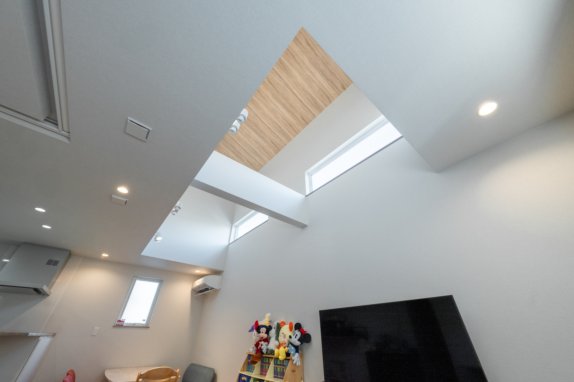 視線が自然と上へと抜ける構成にすることで、リビングにいながらも空や光の気配を感じられる、開放感のある住まいを実現しています。