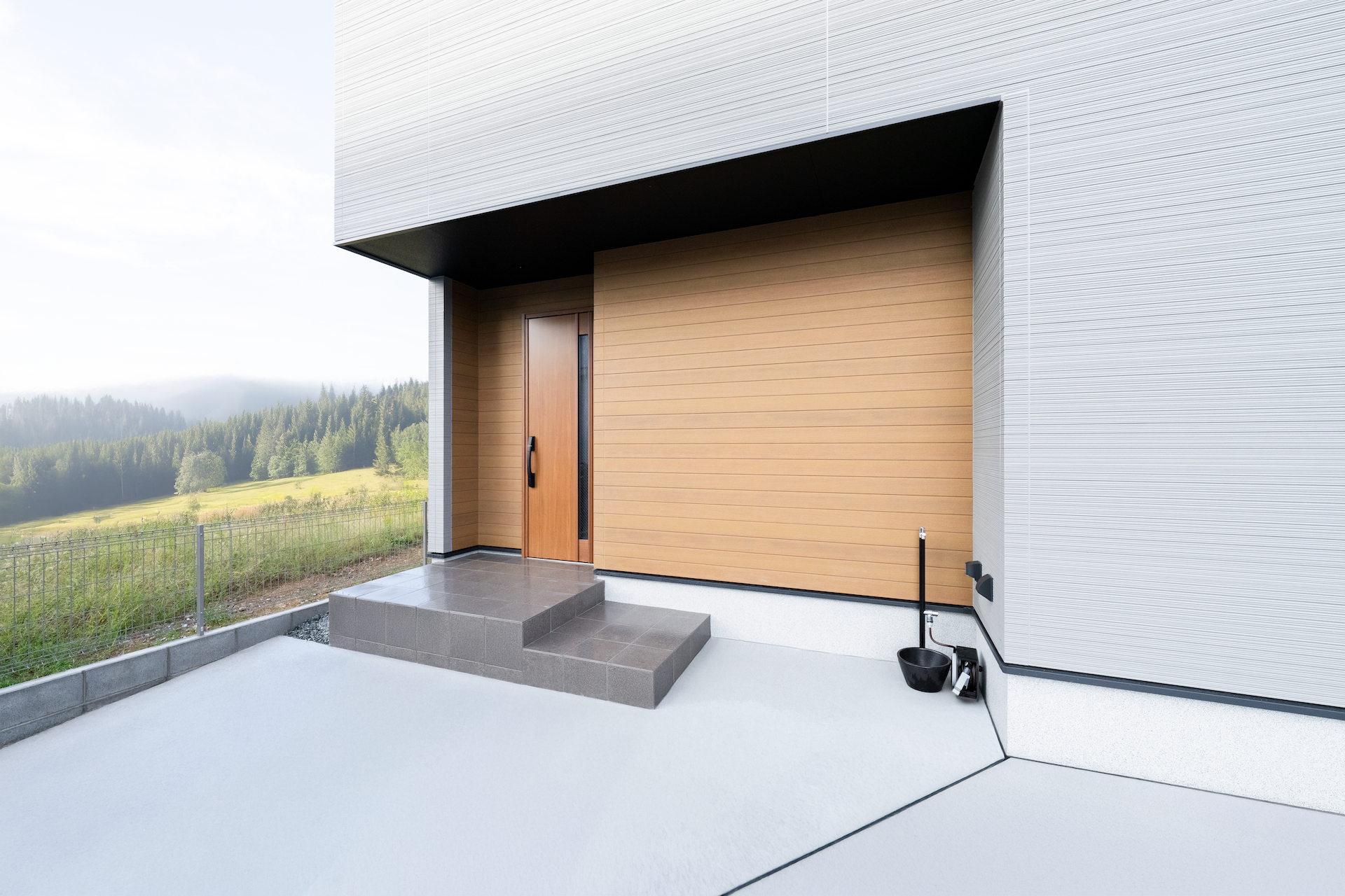 玄関まわりには木の質感を添え、住まいへと気持ちが切り替わる“間”を演出。無機質になりがちな新築外観に、温度を感じるアクセントを加えています。